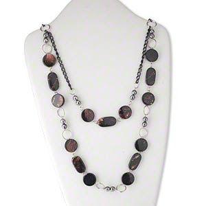 $8.00 Necklace, gunmetal-finished steel and brass, black and brown, steel beads with plastic accents on gunmetal-finished steel chain, 22 inches with gunmetal-finished brass lobster claw clasp.